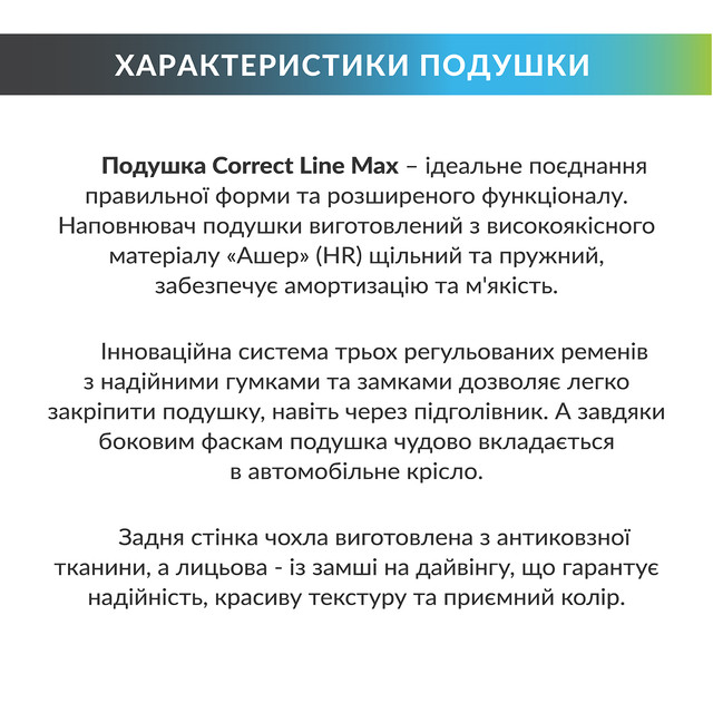 Інноваційна система трьох регульованих ременів з надійними гумками та замками дозволяє легко закріпити подушку, навіть через підголівник. А завдяки боковим фаскам подушка чудово вкладається в автомобільне крісло.